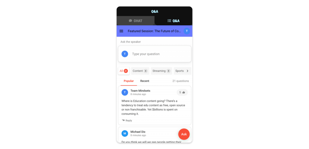 The Q&A tab, on the other hand, is where the hybrid action actually happens. This feature allows online attendees to submit questions directly to the organizers and lecturers. They can be upvoted and replied to, so organizers can pick which ones they want to answer on stage.